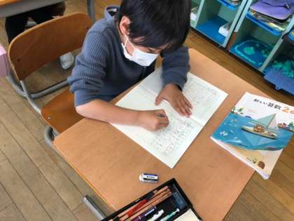 47−15の計算の仕方を考えました。「まず」「次に」などの接続詞をつけて、友達に伝えやすいように順序立ててノートに書いていました。図や式も用いて、一人一人が考えをもつことができました。