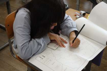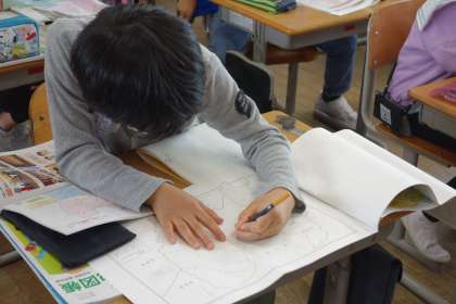 富山県の市町村を調べ、白地図に書き込みました。知っている、聞いたことのある市町村に反応する子供たちでした。