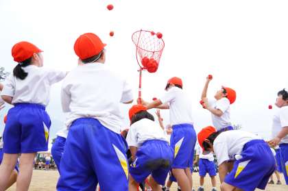 リズムに乗ってダンス&2年生と力を合わせて玉入れ。団長さんからも応援の声をかけてもらい、やる気がアップしました。