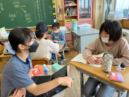 国語科「きいて、きいて、きいてみよう」の学習の様子です。考えた質問を聞き手から話し手に質問し、記録者がインタビューの内容をまとめました。事前に質問を考えておいたことで、5分間うまく話を繋ぐことができたようです。