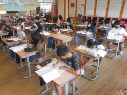 算数科で小数をかけるかけ算の筆算の仕方を学んだ5年生。計算練習のときは全員が真剣に取り組んでいます。