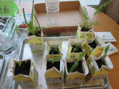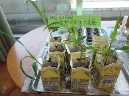 とうがらしの種から芽が出ました。とうもろこしもぐんぐん育っています。