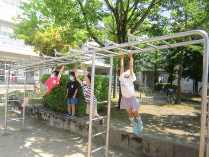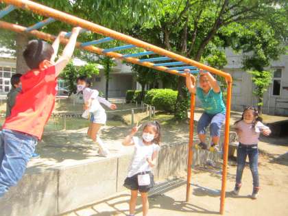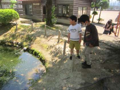 グラウンドに出て、友達と遊具で遊んだり、池を観察したりして、元気いっぱいに遊んでいます。