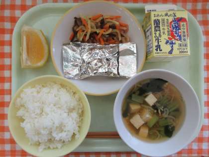 今日の献立は、ごはん、さばの銀紙焼き、大根の中華きんぴら、すまし汁、河内晩柑、牛乳です。