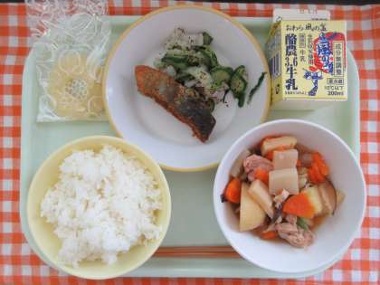 今日の献立は、ご飯、魚の米粉揚げ、ゆかりあえ、筑前だき、冷凍パイン、牛乳です。