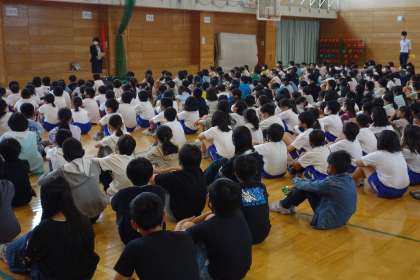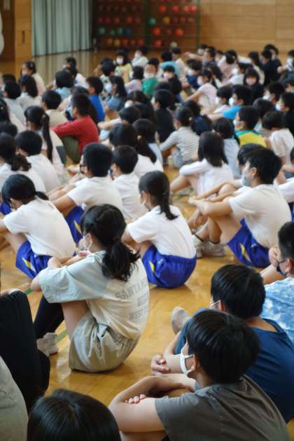 今日は避難訓練を行いました。火災を想定して、体育館に避難しました。上学年が真剣な態度で取り組んでいたため、それを手本に下学年も落ち着いて行動することができました。校長先生と目をつなぎ、しっかりと話を聞く宮野っ子の姿が素敵でした。