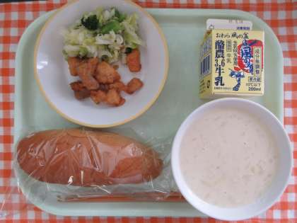 今日の献立は、黒糖コッペパン、鶏肉のマーマレードソースかけ、イタリアンサラダ、ビーンズポタージュです。