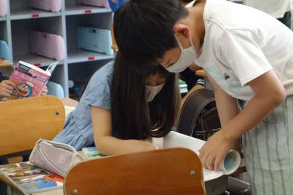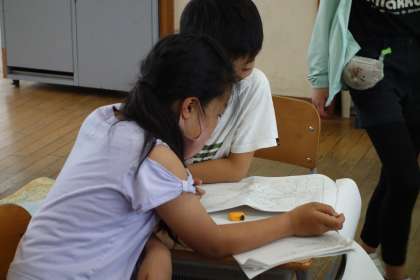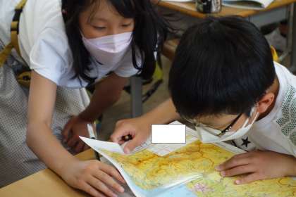 白地図を用いて、交通の広がりを調べました。難しい道路や鉄道、港の名前が並び、苦戦する子供たち。地図をじっくり見ながら、教え合う姿が見られました。