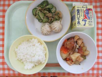 今日の献立は、ごはん、酢豚、えびパオツ、華風和え、牛乳です。