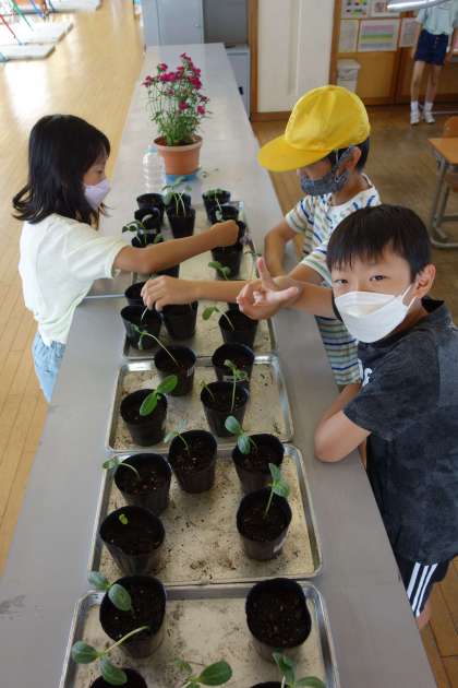 朝、教室の来るとヘチマの様子を見に来る子供たち。休みのうちに大きくなったヘチマの様子を見て、うれしそうでした。