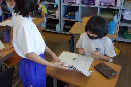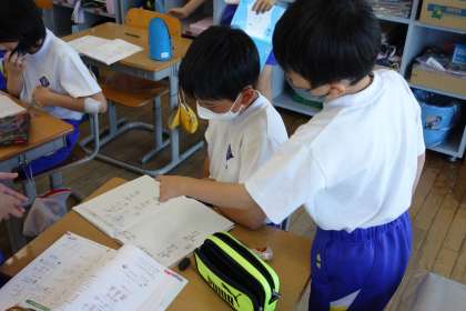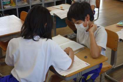 割り算の筆算にトライ中の子供たちです。友達の説明を聞き、できるようになろうと努めています。また、友達に「教える」ことで理解を深めています。