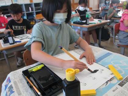 今日の書写では、筆に墨汁をつけ、横画を書きました。これから様々な字を書くのが楽しみですね。