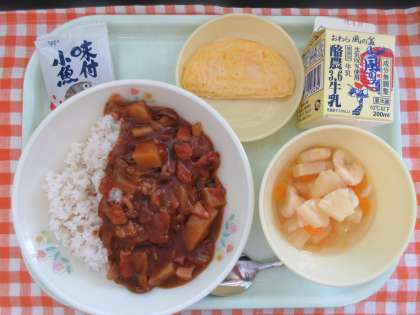 今日の献立は、麦ごはん、たべキリンハヤシ、オムレツ、フルーツポンチ、味付け小魚、牛乳です。