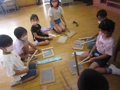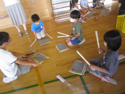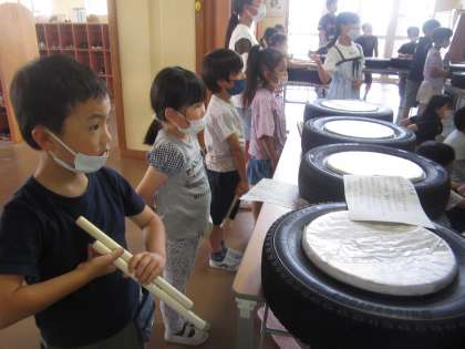 初めての和太鼓活動でした。6年生にたたき方やリズムを丁寧に教えてもらいました。「伝統」を引き継いでいく1年生です。