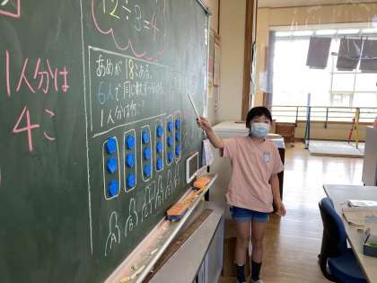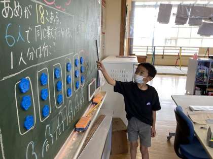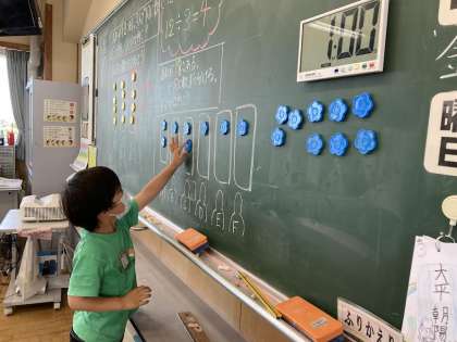 算数の学習の様子です。おはじきを動かしたり、友達のほうを向いて説明したり、黒板をつかって学習を進めています。