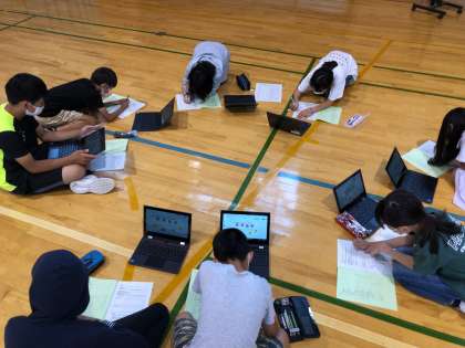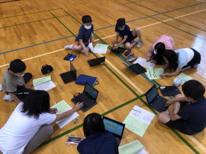 今日は、初めて5・6年生で集まり、目当てや班の役割を決めたり、しおりの説明を聴いたりしました。