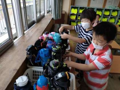 今日は、全ての学習をやり終えた子供たちが、教室の中の整頓を行ってくれました。「水筒片付け名人」「学習道具片付け名人」…みんな、喜んで教室をきれいにしてくれました。