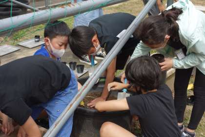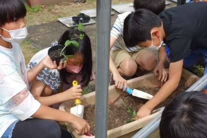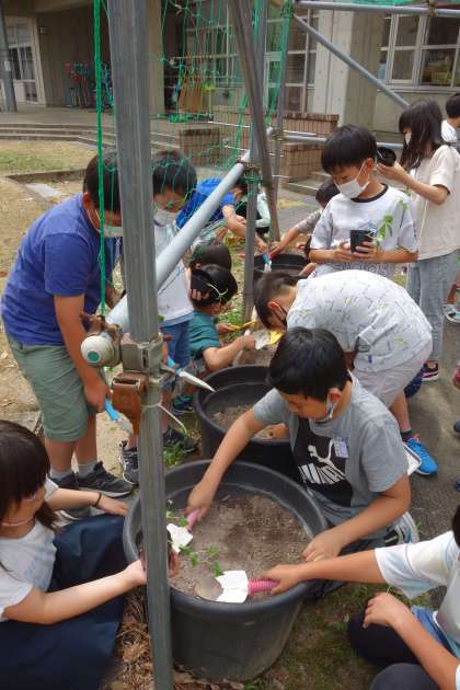 ヘチマが大きく育ってきたので、協力して外のプランターに植え替えました。