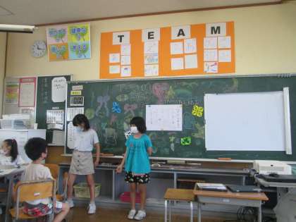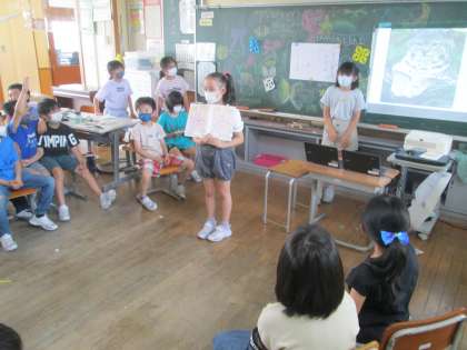 スライドを作り、スクリーンに投影しクイズを行う児童もいました。