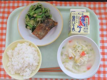 今日の献立は、ごはん、魚の竜田揚げ、小松菜ひたし、呉汁、牛乳です。
