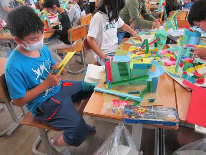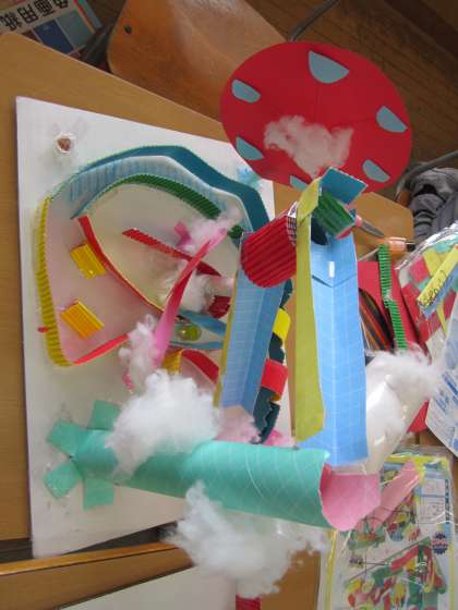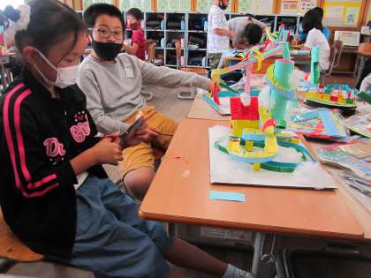 ほとんどの子が完成し、画用紙や色鉛筆などで最後の仕上げをしました。