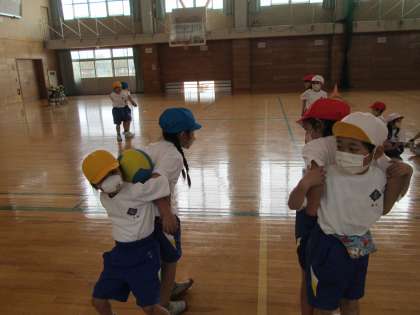 友達と背中合わせになって、色々な運動に取り組みました。背中合わせで立つ運動は、なかなか難しかったようです。「せーのっ」と息を合わせて立ち上がっていました。お家でも是非やってみてください。