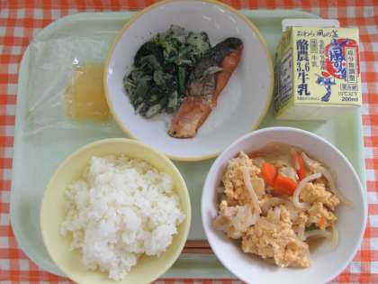 今日の献立は、ごはん、ふくらぎの照り焼き、よごし、卵とじ、冷凍りんご、牛乳です。