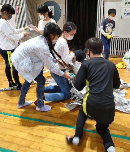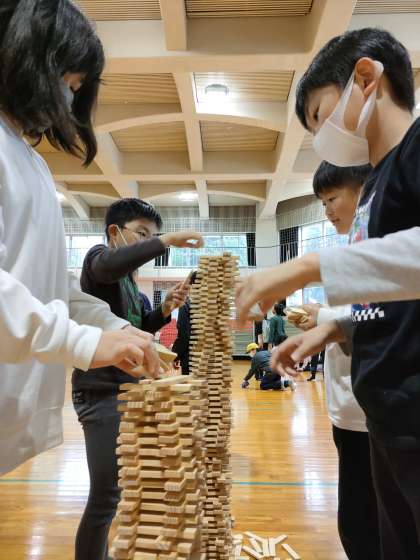 雨になり、少し早く活動を切り上げ、宿泊棟へ戻りました。プレイホールで、遊びリンピックを楽しんでいます。さらに、班の仲間の、絆が深まります。