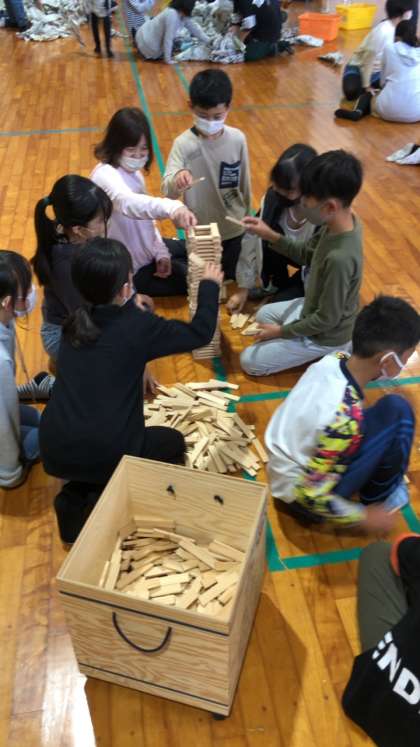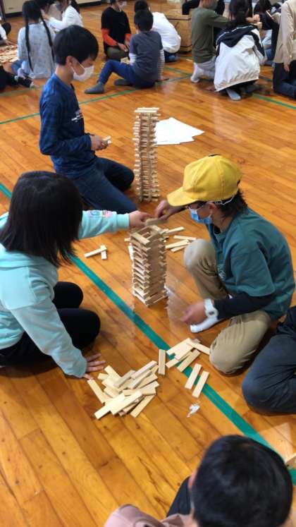 木の板を積み重ねてタワーや建物を作る遊び『カプラ』に子供たちが熱中しています。