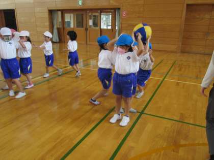 ボールをパスするリレーをしました。ボールを落とさないこと、友達が受け取りやすく渡すことに気を付けていました。