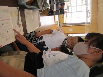 先生の隣で割り算をしている子にみんなが集まってきて、『どこがわからないの〜?』と、わからない子に教え合う姿が見られました。