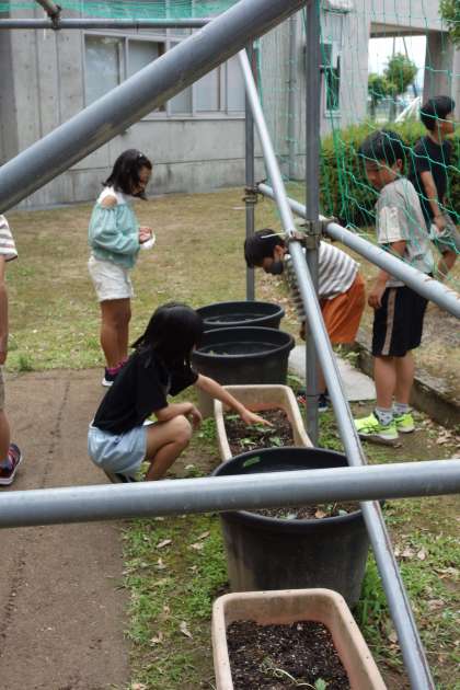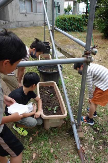 ヘチマの様子が気になって、休み時間に様子を見に来ていました。大きく成長してほしいですね。