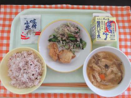 今日の献立は、雑穀入りごはん、鶏肉のから揚げ、ゆかり和え、すいとん、味付け小魚、牛乳です。