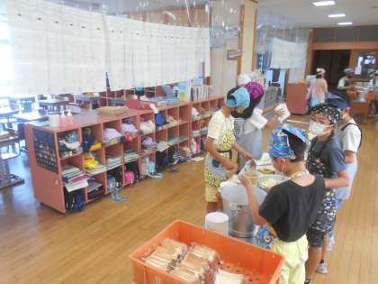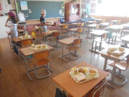 給食の準備中、6年生が校外学習から帰ってきていないことに気付いた5年生が、友達と声を掛け合い、6年生の分の給食準備・配膳を協力して行いました。