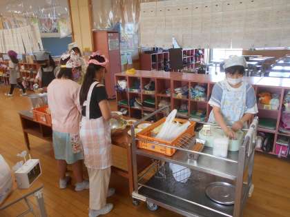 校外学習から帰ってきた6年生が、自分たちの給食の準備が整っているのを見て驚き、5年生に感謝の気持ちを伝えに来てくれました。5年生はとても嬉しそうにはにかんでいました。