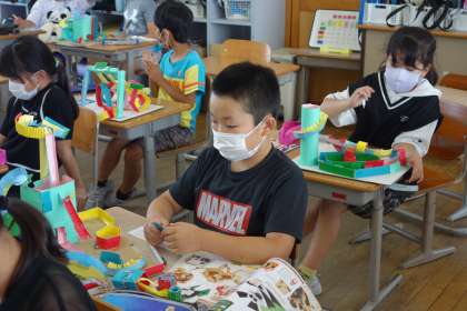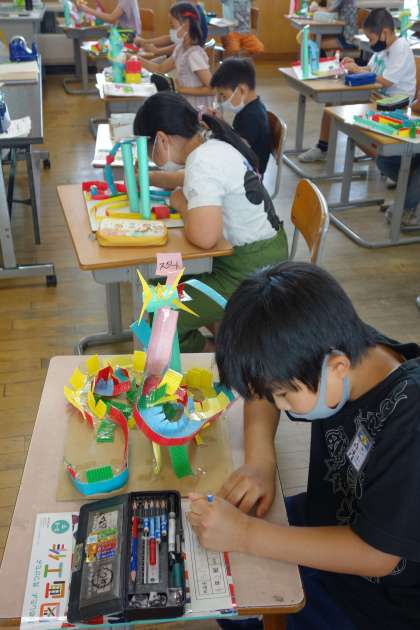 自分が作った作品を見ながら、タイトルを考えています。ぴったりのタイトルが思うかんだようです。