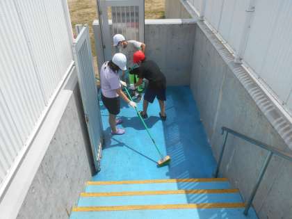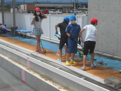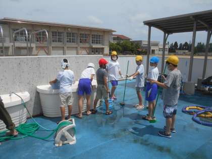 5年生は、プールサイド、側溝、更衣室、プール入口を清掃しました。だんだんときれいになっていく様子を見て、子供たちは達成感を感じていました。