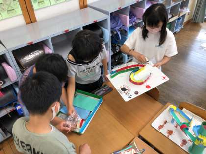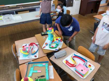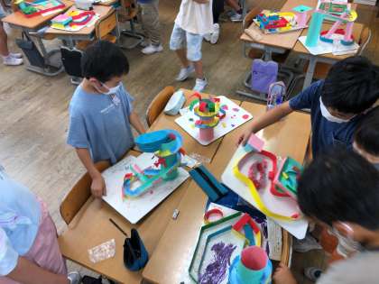 仕上がった図工の作品をグループの仲間と交換し、遊びました。遊ぶことを通して、その作品のよさに気付くことができました。