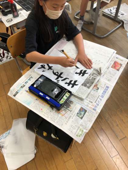練習で書いた自分の字と手本や友達の字を比べて見ると、直したいポイントが明確になります。今日は、清書。目当てをもって取り組みました。