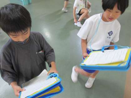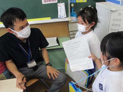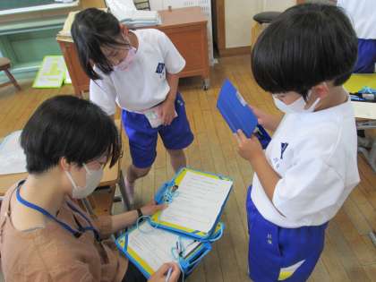 生活科の学習では、学校の先生と仲良くなるための活動をしています。今日は、2階にいる先生たちに会いに行き、自己紹介をしたり質問の答えを書いてもらったりしました。緊張している様子でしたが、上手くインタビューができると嬉しそうな表情で教室に戻ってきていました。