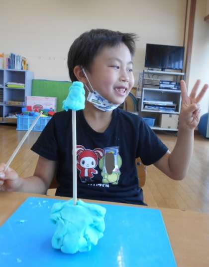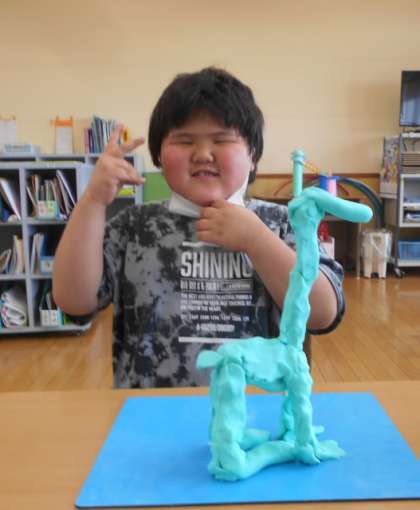 割り箸を芯材にして、粘土作品を制作しました。粘土だけではできない細くて高い作品をつくることができます。その特徴を生かして、「キリン」と「ろくろ首」をつくりました。上級生に「すごい、どうやってつくったの?」「上手だね」と、たくさんほめられました。