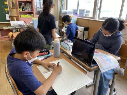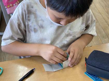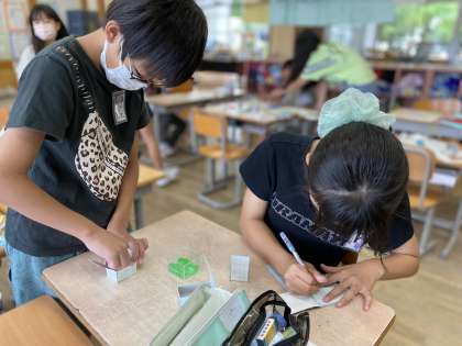 直方体のかさを1立方センチメートルの積み木何個分かで比べます。ペアで協力して、展開図を書いたり、積み木を敷き詰めて数を調べたりしました。
