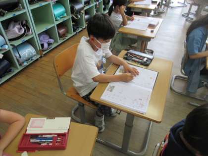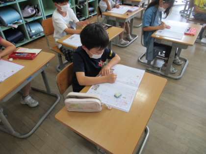 漢字を新しく習う時に、書き順や字の形、熟語などたくさんのことを真剣に覚えています。字の練習では、姿勢を正し、静かに練習しています。