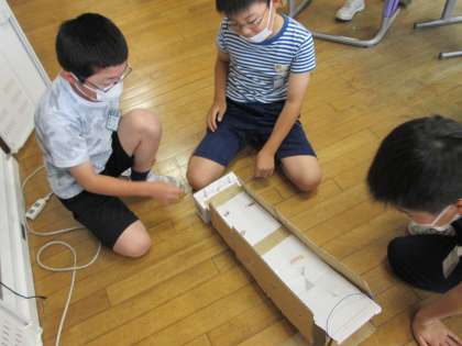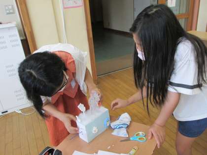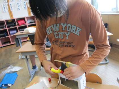 図工の作品を仕上げています。友達にアドバイスをもらいながら、さらにすてきな作品になるように工夫していました。