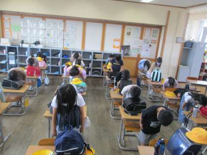 3年生は、いつも気持ちのよい挨拶をしてくれます。帰りの挨拶では、脱帽をして、椅子を全員入れているか確認してから挨拶をします。そして、こんなにも素晴らしい礼をして、元気よく「さようなら」と言ってくれます。これからも素晴らしい挨拶続けていきましょう。