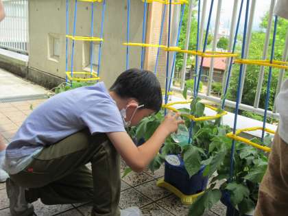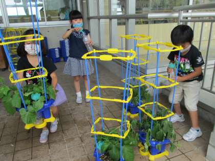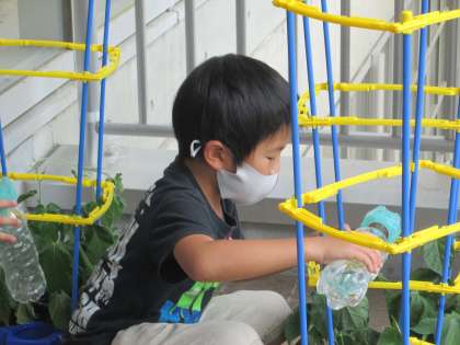 二日間の休みが明けて、あさがおの様子を見に行ったら、つるが伸びていてビックリ。さっそく支柱を立てました。
