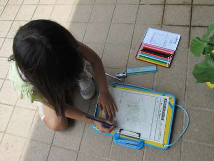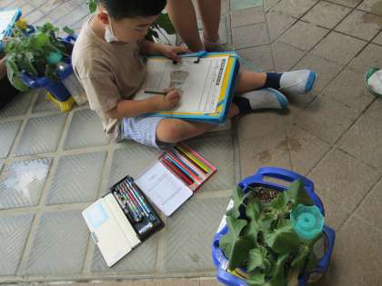 少しずつつるが伸び始めてきたあさがおの様子を観察しました。
