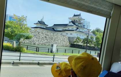 ライトレールの環状線に乗車しました。車窓から、街の様子がよく見えます。富山城が見えて、大喜び!