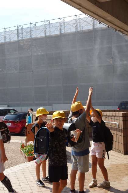 児童玄関前に用務員さんがミストシャワーを取り付けてくださいました。今日は暑い日だったので、下校時にミストシャワーを浴びて、元気に下校しました。