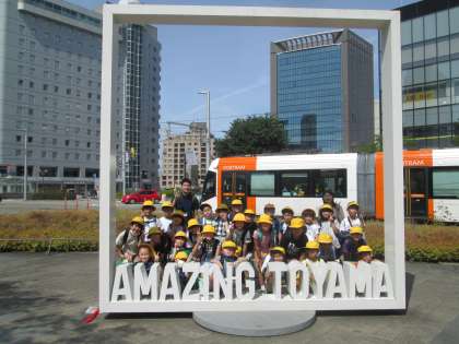 「AMAZING TOYAMA」の前にて、集合写真を撮影しました。シャッターを通近くにいた方にお願いしたのですが、なんと市内電車が丁度背景に!素敵な一枚になりました。撮ってくださった方、ありがとうございました。